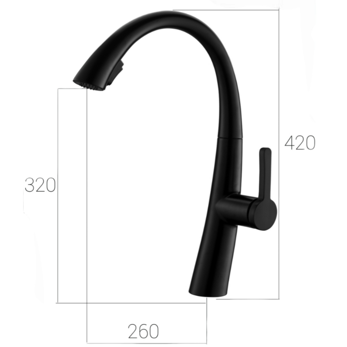 Този черен кухненски смесител представлява съвършено съчетание от съвременен дизайн и висока функционалност, което го прави идеален избор за всяка модерна кухня. Със своя изискан и минималистичен вид, този смесител не само ще привлече вниманието, но и ще допринесе за стилния облик на вашето кухненско пространство. Изработен от висококачествени материали, смесителят е проектиран за дълготрайна употреба, устойчивост на корозия и запазване на своята естетика през годините.С размери: височина на смесителя 420 мм, дължина на чучура 260 мм и височина на чучура 320 мм, смесителят предлага удобство и практичност. Високият извит чучур осигурява достатъчно място за лесно напълване на големи съдове и позволява свободно движение при работа в мивката. Вградената функция за издърпващ се душ предлага две режима на водния поток - стандартен и разпръскващ. Това дава възможност за лесно превключване между различни задачи, като например измиване на плодове и зеленчуци или почистване на мивката.Ергономичният лост за управление е проектиран за лесно и интуитивно ползване, осигурявайки прецизен контрол върху температурата и силата на водния поток. Лостът се движи плавно и леко, което прави ежедневната употреба удобна и приятна.Изработен с най-високо внимание към детайлите, този смесител предлага не само визуална привлекателност, но и изключителна издръжливост. Използваните материали и финиш гарантират, че продуктът ще остане в отлично състояние дълги години, дори при интензивно използване. Смесителят е проектиран да издържа на ежедневни натоварвания, като същевременно запазва своя елегантен вид и функционалност.Този смесител не е просто обикновен аксесоар за вашата кухня - той е инвестиция в комфорт, стил и качество. Със своята универсалност и висок стандарт на изработка, той е перфектното допълнение към всяко модерно домакинство, осигурявайки удобство и естетическо удоволствие при всяко използване. Ако търсите продукт, който съчетава лукс и практичност, този черен кухненски смесител е точно това, от което се нуждаете.